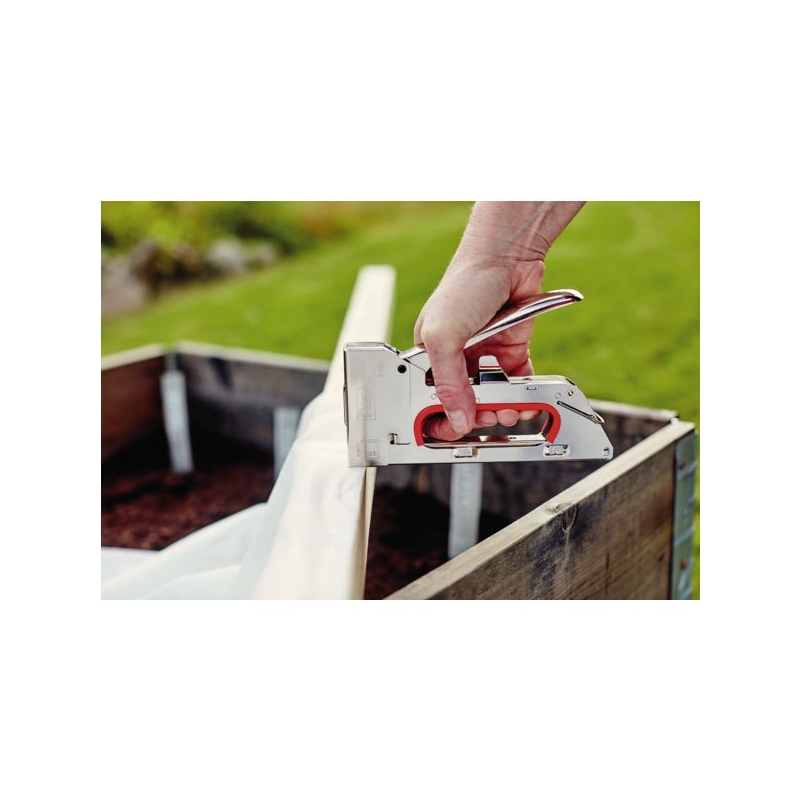Parfaite pour tous travaux de décoration, tapisserie et panneaux muraux. Corps en acier chromé. Amortisseur de bruit et système antirecul. Poignée ergonomique. Utilise des agrafes n°53 de 6 à 14mm. Chargeur : 156 agrafes Poids : 530 g