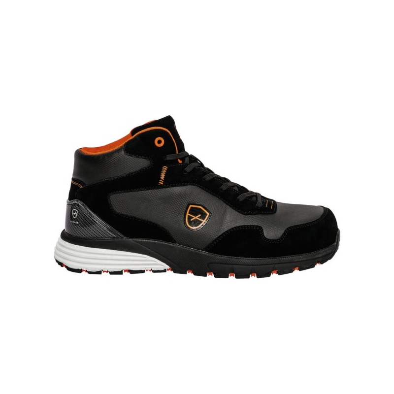 Tige en microfibre et croute de cuir, hydrofuge. Doublure en textile. Première de propreté anatomique et amovible en maille sur mousse PU. Semelle d'usure en caoutchouc / EVA. Semelle antiperforation textile. Embout de sécurité en composite. Poids : 588 g Coloris : noir/orange Pointures : 39 au 48 Norme : CE Cat II - EN ISO 20345 - S3 HRO SRC