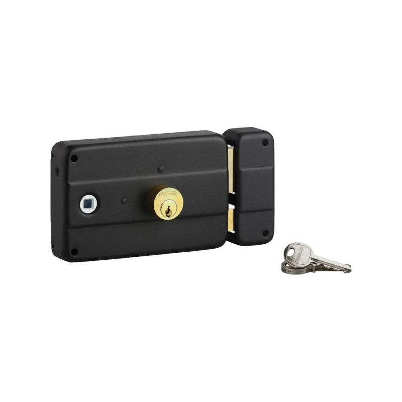 Acier embouti. Pêne et ½ tour en laiton. Mécanisme à 3 tours. Rappel du ½ tour par la clé. Double cylindre (diamètre 25 mm) laiton 5 goupilles. Entrée de cylindre et de fouillot en acier. Livré avec gâche et 3 clés laiton nickelé. Dimensions coffre : 140 x 90 mm Longueur : 45 mm Entraxe : 120 mm Fouillot carré : 6 mm Conditionnement : boite