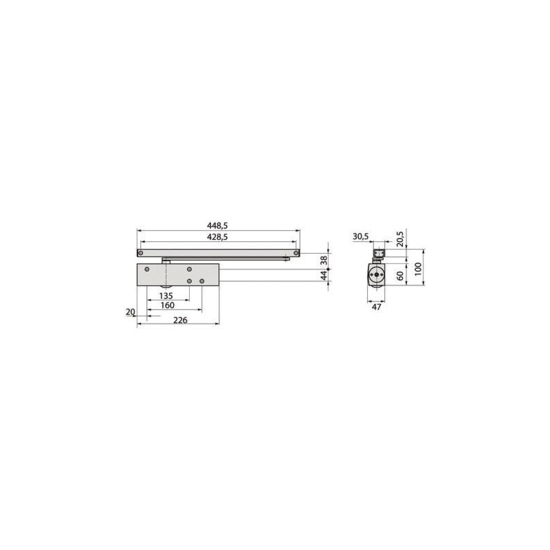 Corps seul, technologie crémaillère elliptique. Force de fermeture réglable 1 - 2 - 3 ou 4. Réversible droite ou gauche en montage normal ou inversé. Vitesse de fermeture et à-coup final réglables par vis frontale. Conforme aux normes NF EN 1154 et NF EN 1634. Homologué CE, CF/PF et PMR. Largeur du vantail : jusqu'à 1100 mm Poids du vantail : jusqu'à 100 kg Conditionnement : boite