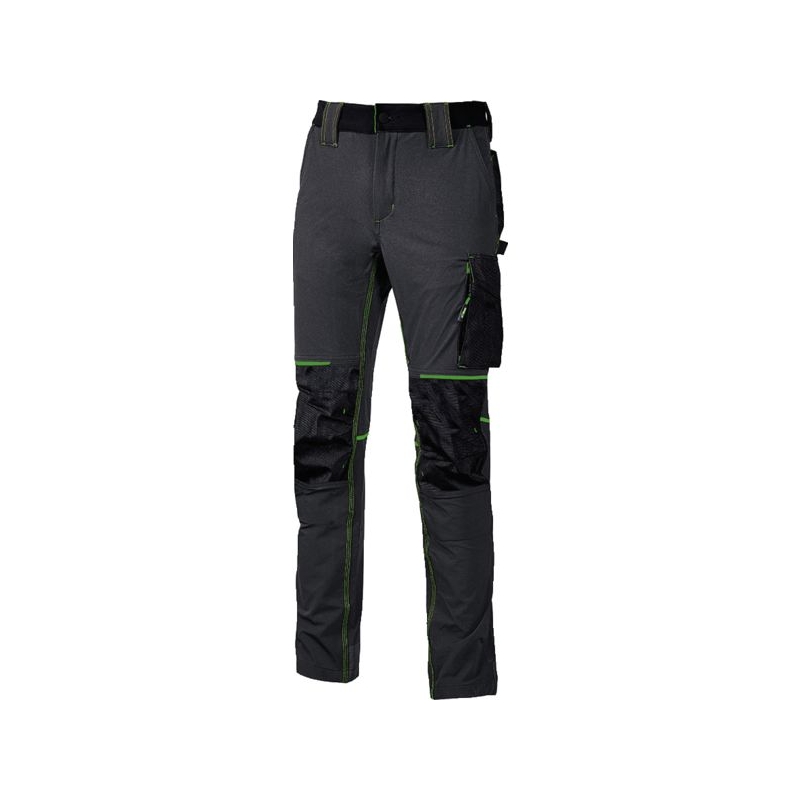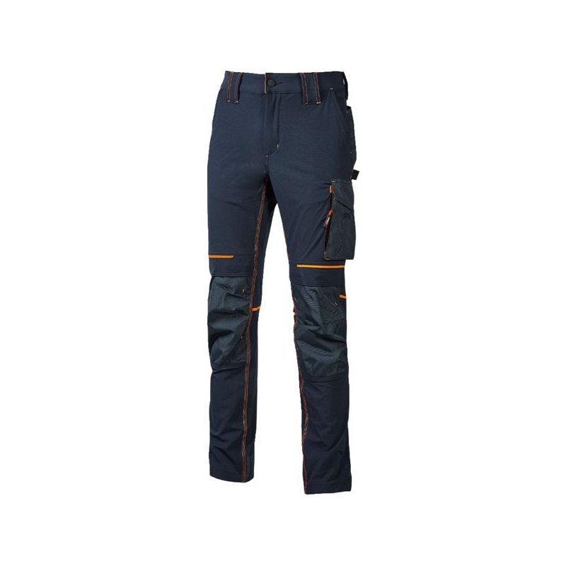 90% nylon 10% spandex, 260 gr/m2. Tissu stretch, doux au toucher, déperlant, respirant et au séchage rapide. Poche latérale porte-outils, poche latérale multifonction avec porte badge rétractable, 2 amples poches à l’arrière, 2 poches porte-genouillère à ouverture facile par le haut (réf 103541 à commander séparément), poches zippées cachées sous la grande poche latérale et sous la poche avant droite. Bas de pantalon entièrement renforcé en polyoxford 600D. Bavette à l’arrière pour une meilleure protection lombaire. Taille élastiquée avec un système innovant de serrage invisible. Coloris : noir/jaune, marine/orange Taille : M à 2XL