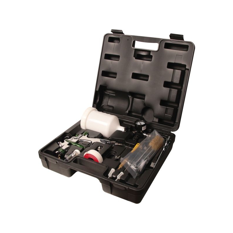 Kit complet avec pistolet basse pression en coffret. Poignée en aluminium. Ensemble buses 1,5 et 1,8 mm. Godet plastique gradué de 0,6 l. Réglages débit air, débit peinture et largeur du jet. Régulateur de pression. Consommation air : 175 l/mn Poids : 0,640 kg Raccord entrée d'air : 1/4’’ Pression d’utilisation : 2 - 2,5 bar Largeur jet maxi. : 220 mm Consommation moyenne produit : 90 cm³/mn