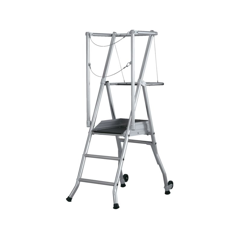 Utilisation sur sol plat. Usage intensif. En aluminium. Garde-corps fixe 360° avec portillon semi-automatique rigide. Plate-forme 400 x 490 mm avec plinthes intégrées. Marches striées antidérapantes de 60 mm. Tablette porte-outils. 2 roulettes Ø 100 mm pour les déplacements. Béquille arrière adaptée pour le passage des WC (sauf modèle 2 marches). Modèles 4 et 5 marches avec stabilisateurs. Charge maxi. : 150 kg Norme : PIRL NFP 93353 - Décret 2004.924