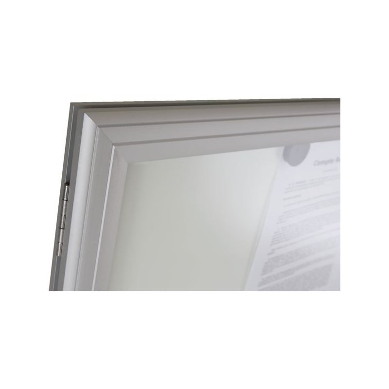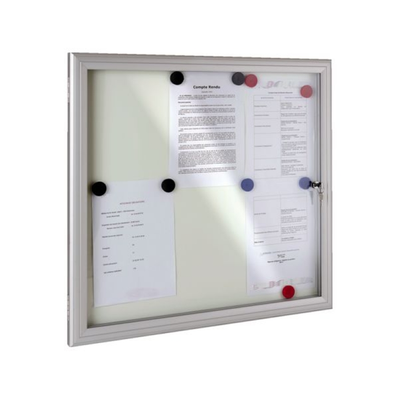 Vitrine réversible avec fond tôle laquée électrozinguée (affichage magnétique). Porte battante démontable avec charnière inox. Encadrement aluminium anodisé, façade verre Sécurit 4 mm. Fermeture par serrure dans le vitrage. Fixation murale 4 points. Épaisseur hors-tout : 35 mm Épaisseur utile : 21 mm Existe en noir, gris et rouge.